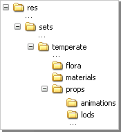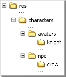 avatars - Contains one sub-folders for each avatar type. The folder knight in the example above contains the model, visual, primitives, LOD, and texture files for the knight avatar.