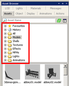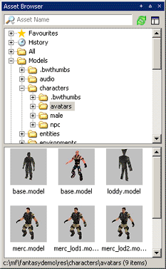Working with the Asset BrowserThe Asset Browser is a resource browsing facility built into all the BigWorld content creation tools (WorldEditor, ModelEditor and ParticleEditor). It can be accessed from the Assets tab in any of the content creation tools.