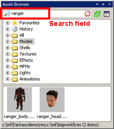 The dynamic search field will further limit the displayed resources to those resources containing the text typed in the search field. In the example above the Asset browser is displaying all models (because the Models virtual folder is selected) with the text "ranger" in their model name.