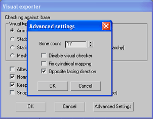 Opposite Facing Direction Characters and NPCs should be modelled so that they are facing away from the front viewport. If a character has been rigged with the incorrect BigWorld setup (i.e.. facing forward) it can be fixed using the Opposite Facing Direction option within the exporter.
