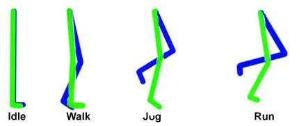 Example 2. This transition occurs as the walk animations is half way through its cycle (frame 15). The BigWorld engine cleverly blends in the new run animation at half way through its cycle (frame 16) to maintain perfect blending.