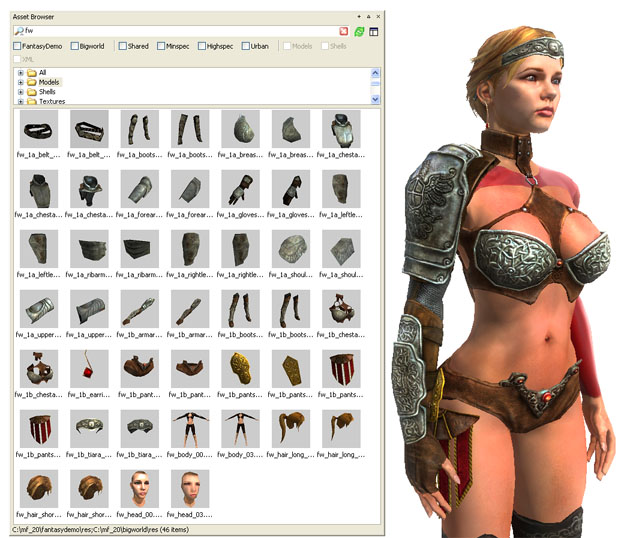 SupermodelA supermodel is a model made up of several separate model files that are all rigged to the same skeleton. A good example of this is the Female Warrior character in the Fantasy Demo. Each piece of the warrior's armour is rigged to the same skeleton that the warrior's base mesh is rigged to. The BigWorld engine simply loads both models and deforms them with the same skeleton. The image below shows the large number of separate models that can go together to make the final supermodel.