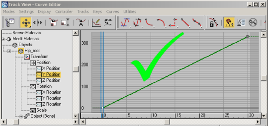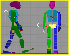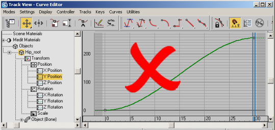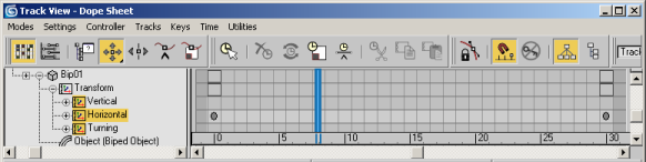 This means that an object such as a biped can only have two keys for its horizontal movement: a start key frame, and an end key frame. Any number of keys is allowed for non-translational keys. For example, the root node may move side to side, and up and down.