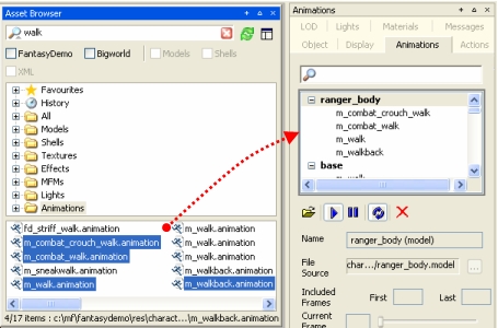 Alternatively, you can add animations to a model by dragging animations from the Asset Browser to the animation window.