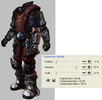Compressing animationsThe BigWorld Engine automatically compresses animations. The animation compression facility within ModelEditor allows animators to adjust these compression settings using a visual tool that shows changes to compression in real time.