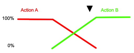 Its important to recognise that strong node blend values will effect the blend in and blend out times between actions. In the diagram below a node with a strong blend weight in Action A will still be the strongest influence at the time marker
