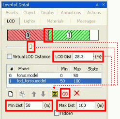 The LOD Dist field represents the distance between the model and the game camera. The model will remain in use until the value for that model is reached, then the next LOD model is loaded. If the model is closer to the camera, a more detailed model is loaded. Similarly, if the model moves away then a less detailed model is loaded.