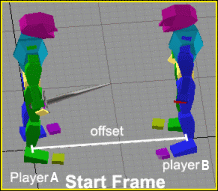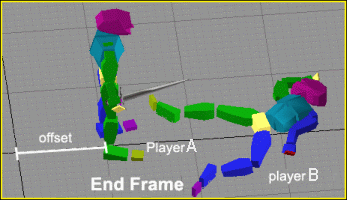2 Because the player has moved in a non-linear motion from its original position to the last frame, it must have an action assigned to it in ModelEditor, with the IsImpacting check box selected. Also because it is coordinated with player B it must use the IsCoordinated tag. This option will recognise the offset in the game, and update the entity's position at the completion of the animation.