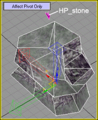 To centre the stone object, select and move it to the origin with the hard point still linked to follow. Align the pivot point of the stone to the origin. The object mesh should sit naturally on the home-grid as though the grid itself was the terrain level.