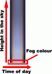 Fog Colour The fog colour is determined by the time of day and colour of the bottom line of pixels in the sky colour gradient texture. The texture is read from left (morning) to right (night), as illustrated below.