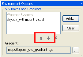 The grayed out Weather Systems entry within the sky box window allows you to decide if your static sky boxes are to be drawn in front or behind the weather systems by moving them above or below the Weather Systems entry. A mountain ring for example would need to be drawn in front of the weather systems (The clouds do not obscure the mountains), whilst a large planet in the sky is definitely going to be obscured by weather systems.