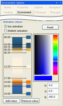 Ambient and Sun Light Both the colour and value of the sun and ambient lights can be animated throughout the course of the day. Keys can be created and removed, and the colour of each key can be altered.