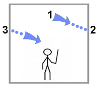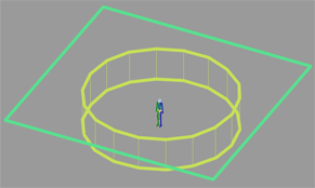 A particle created at position 1. will hit the barrier at position 2 where it is teleported to position 3. This ensures that the density of particles remains high around the player.