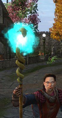 In summary we imported the BigWorld Model "sets/town/props/staff.model" and called it "m". We then swapped the player model for "m". We imported Pixie (particle module) so that we could add the particle system "staff_idle.xml" to the world. The staff_idle.xml particle system was then attached to the HP_Spell node of m.
