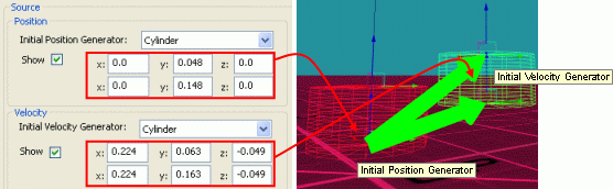 x, y, z fields and 3D gizmos for Cylinder Initial Position Generator and Initial Velocity Generator