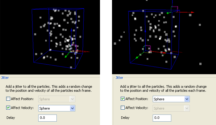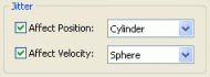 | Affect Velocity | Check box | Indicates that the jitter effect should be applied to the particles' velocities. | Drop-down list box |