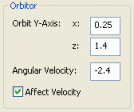 Orbitor sub-panelThe Orbitor sub-panel causes particles to orbit around a vertical line along the y-axis.