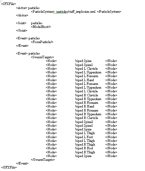 The SFX file is simple to follow, it takes the staff_implosion particle system and plays (ForceParticle) the particle system on the models root node (ModelRoot). A single particle will spawn at each node sequentially from the top of the list downward and then repeat.