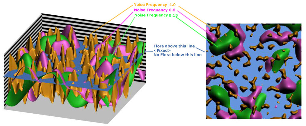 Flora noiseFlora such as grass, flowers, and ferns do not grow evenly dispersed around the world. Instead, they clump together in some places, and do not grow in others.