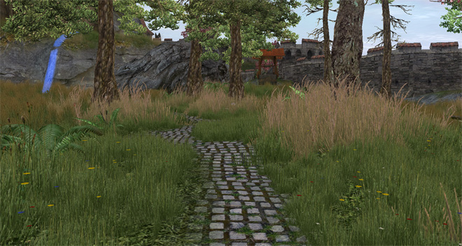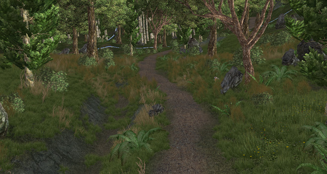 The <weight> tag mentioned above simply multiplies the value of a given texture in the Flora Blend Map. So when we give the texture path02.tga a weight tag of 4.0 its effect in the flora blend map is 4 times as strong as the other textures, preventing flora from creeping into its territory.