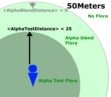 <AlphaBlendDistance> Is measured from the 50 meter mark towards the player. So when set to the default 0, the flora will use alpha blend all the way out to the 50 meter mark.
