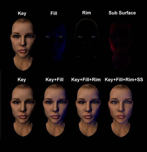 This advanced shader uses the angle of light and camera to simulate the sub-surface scattering that occurs when light enters skin. It also simulates rim/bounced lighting, by increasing the luminance of the side of the model facing away from the primary light source. The amount of the sub-surface scattering is controlled by the alpha channel of the sub surface map, and its colour is controlled by the RGB channels.