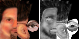Example sub surface map and its alpha channel Areas of thick skin and flesh are dark red, while areas close to the bone are light orange. Dark areas of the alpha map (such as the hair and beard) reduce the amount of sub-surface scattering. |