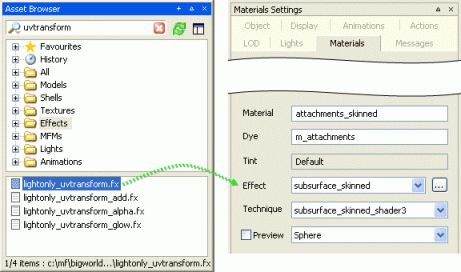 How to apply a shader in ModelEditorFrom ModelEditor's Asset Browser panel, select the Effects virtual folder. This gives you access to all BigWorld shaders.